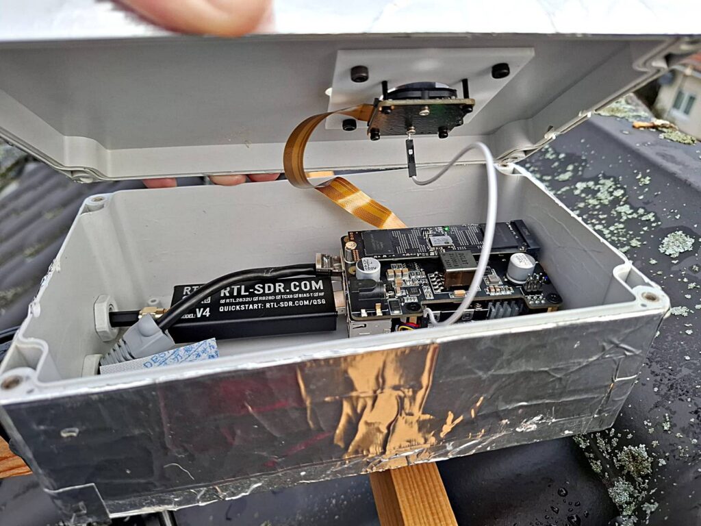 Seit dem 19.07.2025 ist die neue Satellitenempfangsanlage in Betrieb. Integriert in die Empfangsanlage ist die AllSky-Webcam. Die Satelliten-Empfangsanlage basiert auf einem Raspberry Pi 5 mit 8GB RAM, einem RTL-SDR Blog V4 SDR-Stick und einer vor Jahren selbst gebauten QFH Antenne. Im Gegensatz zur alten Anlage, kommt nun keine selbst geschriebene Empfangssoftware mehr zum Einsatz. Bei der neuen Anlage kommt die Software Raspberry NOAA V2 zur Verwendung. Lediglich der FTP-Upload wird noch mit selbstgestrickter Software realisiert, da „Raspberry NOAA V2“ keinen FTP-Upload bietet. Die AllSky-Webcam läuft ihrerseits mit einer über Github verfügbaren AllSky-Software Link zur Software und dient hauptsächlich der nächtlichen Himmelsbeobachtung. Gerade in Hinblick auf Polarlichter und Meteore. Daher kommt auch hier, wie schon bei der neuen doppelten Wetter-Webcam, ein Waveshare IMX290 Kameramodul zum Einsatz. Mit seinen 2,9um x 2,9um großen Pixeln, kann der IMX290 Kamerachip viel mehr Licht sammeln, als Bildsensoren mit deutlich kleineren Pixelmaßen. Der IMX290 ist daher auch in günstigen Astrokameras, wie beispielsweise der Bresser FullHD Astrokamera verbaut.