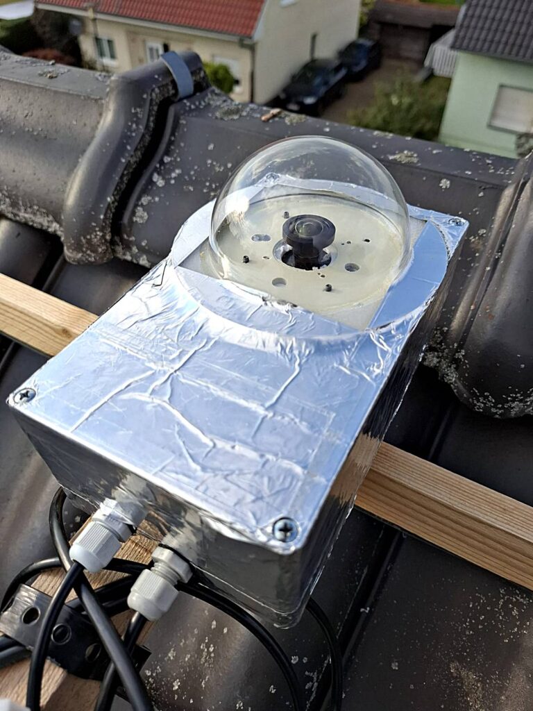 In diesem mit Aluklebeband umklebten Kasten, befindet sich die Technik. Das Alu-Klebeband dient hauptsächlich der Reflektion von Sonnenstrahlen, um eine Überhitzung des Raspberry Pi zu verhindern. Leider klappt dies an heißen Sommertagen nicht so richtig. Teilweise erreichen die Innentemperaturen Werte, welche den Raspberry zum Heruntertakten veranlassen, um sich nicht noch weiter aufzuheizen. Um zu vermeiden, dass Feuchtigkeit und Kleingetier ins Gehäuse eindringen, gibt es zudem keinerlei Lüftungsöffnungen. Die Abwärme des Raspberry dringt durch Öffnungen im Gehäuse in die Glaskuppel ein und verhindert dadurch ein Beschlagen der Plexiglaskuppel. Zugleich ist dies die einzige Möglichkeit der Abwärme aus dem Gehäuse zu entweichen.